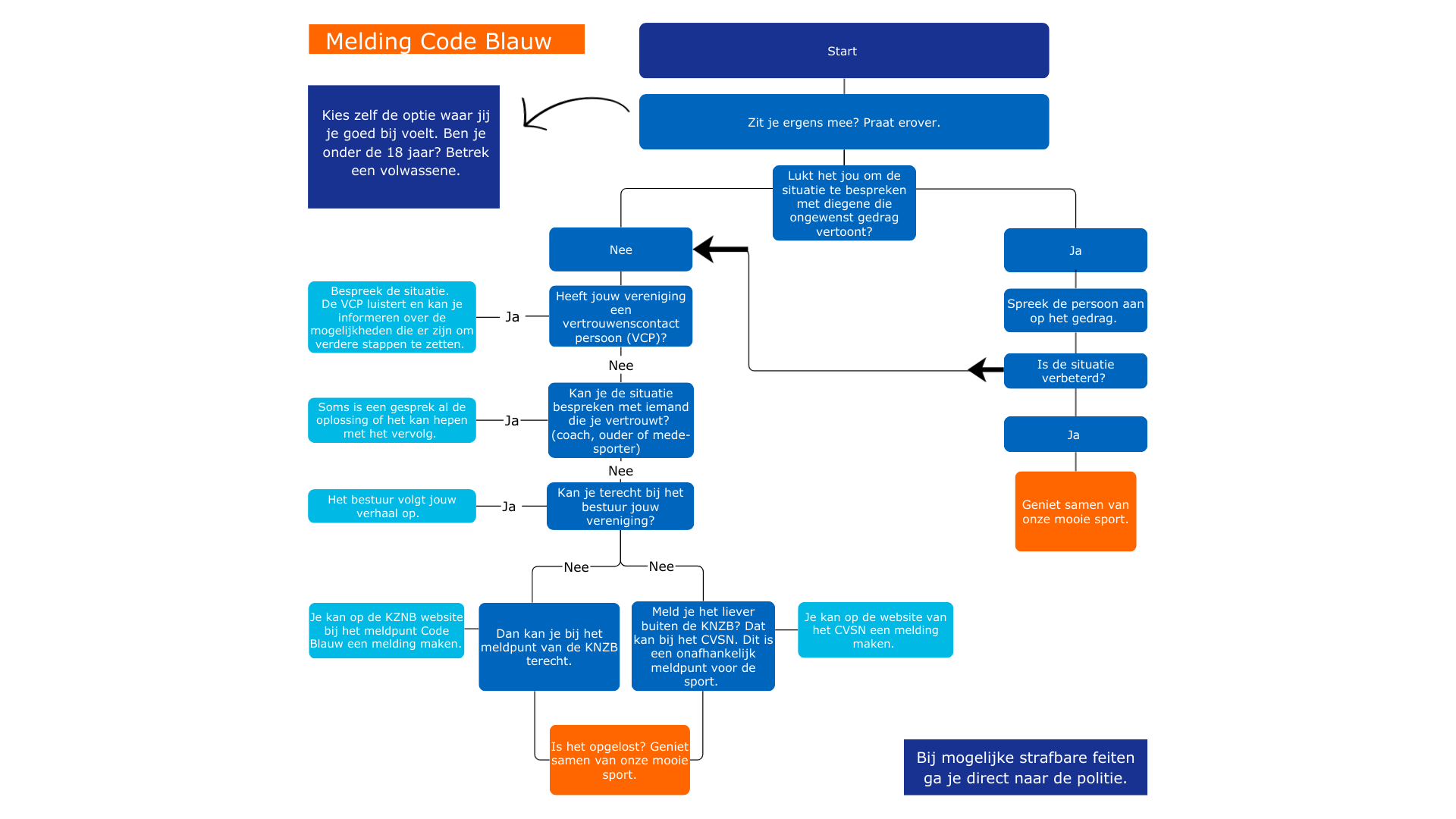Met Code Blauw doen we er als KNZB alles aan om ongewenst gedrag, grensoverschrijdend gedrag en/of niet-integer gedrag te voorkomen. Wanneer het toch misgaat, dan kun je bij ons terecht om een melding te maken. We zullen deze tijdig, effectief en efficiënt op (laten) volgen.