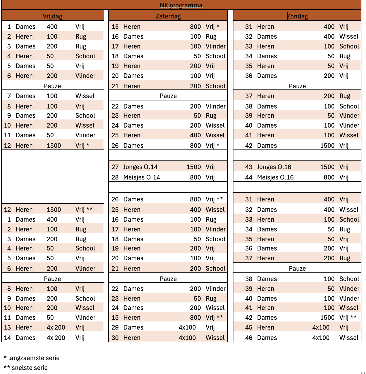 Het programma, de limieten en de wedstrijdbepalingen zijn bekend voor de Nederlandse Kampioenschappen (NK) korte baan en de Nederlandse Junioren Kampioenschappen (NJK) korte baan.