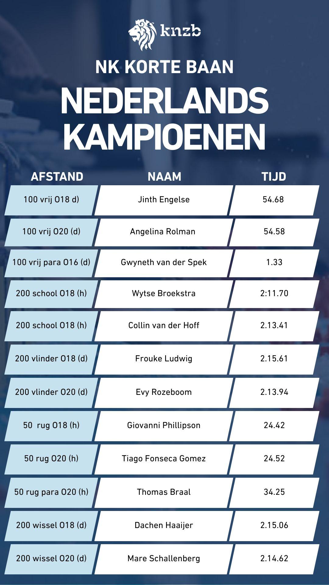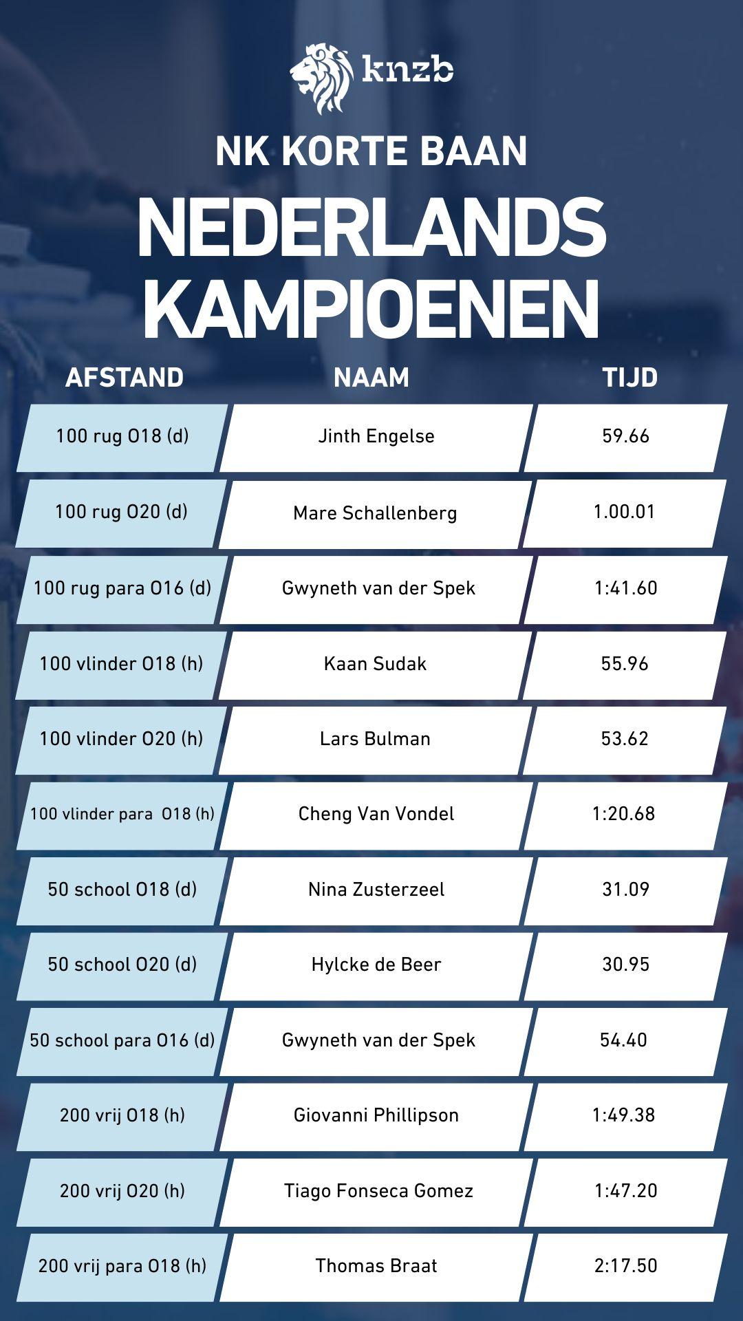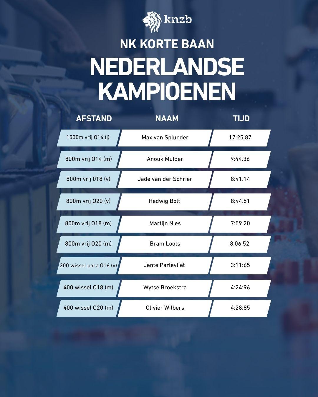 Op de tweede dag van de Nederlandse kampioenschappen korte baan in het Haagse Hofbad zijn er vandaag zowel door de individuele zwemmers als door de estafetteteams snelle tijden gezwommen, nieuwe kampioenen gekroond en records gevestigd. Na de eerste dag begon de ochtend met de 800 vrij (m) en stonden er meerdere juniorenfinales op het programma. Zie onder dit bericht het overzicht van de Nederlandse juniorenkampioenen.