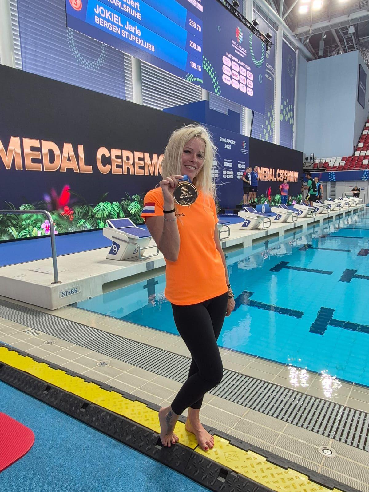 ‘’Het was een grote verrassing, zeker de gouden. Doordat ik vroeger turnde, en pas op mijn 41ste ben begonnen met schoonspringen, ligt de toren mij het beste omdat het een vaste ondergrond heeft. Daarom was het een extra verrassing dat ik wereldkampioen op de 1 meter plank werd.’’