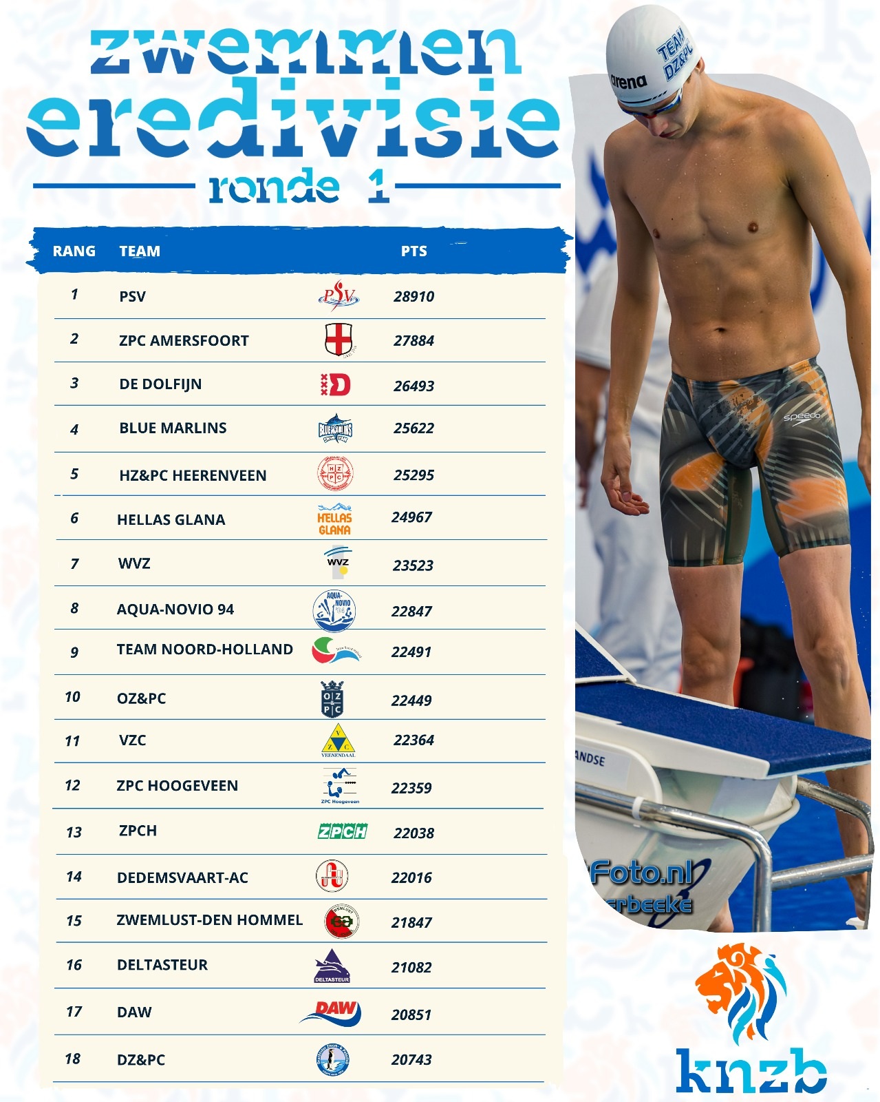 Dit weekend staat de tweede ronde van de landelijke zwemcompetitie op het programma. Het competitieseizoen 2025-2026 bestaat uit vijfde ronden en eindigt in april 2026. Het eerste wedstrijdweekend was 4 en 5 oktober. Vanuit alle divisies en klasses deden er 229 teams en bijna 6.000 zwemmers mee. Lees op deze pagina de terugblik op de eerste ronde. Bekijk via deze link de gemaakte foto’s door Natalie Zondervan, Ivonne van der Meer en Richard Kuipers in Veenendaal, Amersfoort en Heerenveen. Na komend weekend zijn de wedstrijddagen: